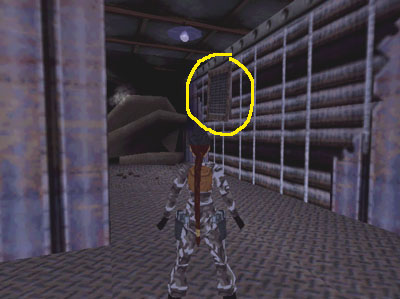 Take a running jump from the balcony to the stacked boxes below the control room on the right. (NOTE: Set it up so Lara takes off close to the end of the broken railing. If you're new to Tomb Raider, see my strategy page for info on setting up jumps.)