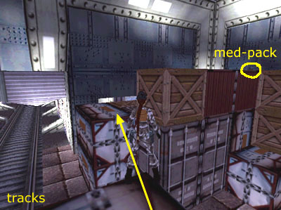 Now, if you want to, you can go after a couple of goodies on top of the crates. (Otherwise, just go downstairs and follow the TRACKS.) Jump from the balcony to the boxes below the control room window, as you did before. From there, jump to the middle stack of boxes. Cross to the other side of the stack and take a running jump to the stacked boxes to the right of the section of wall Lara ripped out (as shown in this screenshot). On top you'll find a small medipack (7) (also marked on the diagram).
