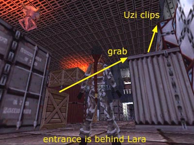 Drop to the floor and return to the corner of the room where you first entered. Climb on the single wooden crate in the stack to the right of the door (left if Lara's back is to the entrance). Take a running jump to grab the edge of the big, metal box on the other side of the entrance. Climb to the top to get some Uzi clips. (8) (This sequence is shown in this screenshot, and the clips are marked on the diagram.)
