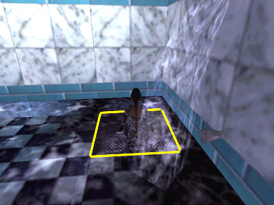 LOCKER ROOM: Enter and shoot the German shepherd (7). Search the lockers to find the DESERT EAGLE PISTOL, Desert Eagle clips, a small medipack, a FUSE and Uzi clips (13-17). Find the grate on the floor in the far right corner of the flooded showers. Stand Lara at the edge of the grate (as shown in this screenshot) and press Action to open it.