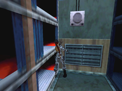 Again crawl backwards to hang from the edge of the shaft. Traverse around to the left and climb out. Climb the nearby ladder. Ahead you can glimpse the control room through the slats. Crawl through the low passageway.