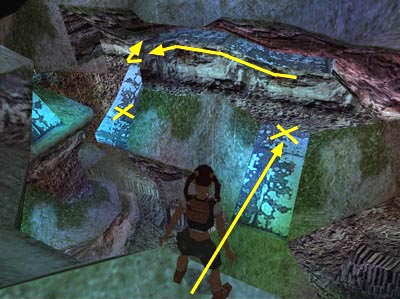 Climb onto the ledge and turn left to face the hollowed-out flat spot in the corner. Stand Lara at the outer corner of the ledge nearest the hollow. Take one walking step back from the edge. Then take a standing jump to a flat area on the rocks. Take another standing jump to the hollow. Pick up a small medipack (4). (This screenshot shows the right starting point and where to jump.)