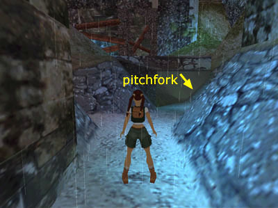 OPEN AREA WITH BOARDED-UP BELL TOWER: Find the misty opening below and to the right of the boarded-up building. Go into this hollow and pick up a broken PITCHFORK (9). (This screenshot shows where it is. If necessary, turn up the brightness on your TV or monitor to help you see, or just walk Lara around under the overhang pressing Action until she finds it.) Climb onto the ledge near the boarded-up openings. Combine the PITCHFORK and RUBBER TUBE to make a CATAPULT (more like a slingshot really, but maybe that's a dialect thing). Use this near the boarded-up openings.