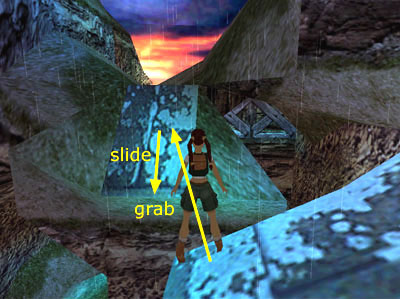 Repeat the jump to the whitewashed ledge and the traverse along the crevice to the next ledge. Turn to face the whitewashed slope (again, it's in this screenshot). Jump to the slope, slide back and grab the edge as you did before. Only this time don't drop. Instead traverse to the right and around the corner until Lara is hanging above a small, rectangular opening. (These screenshots show how.) Let go then immediately press Action to grab the edge of the small opening. Pull up and crawl through.