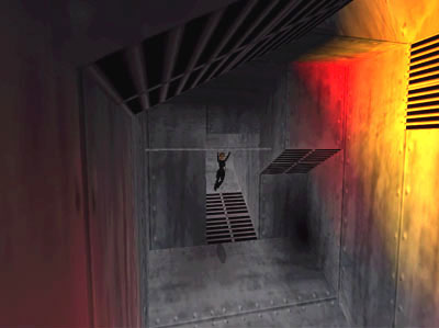 First pivot so Lara is facing downhill before stepping off. (Not shown.) Slide down the first slope and onto a second, perpendicular slope. When Lara reaches the middle of the grate on the second slope (as shown in the screenshot above). . .
