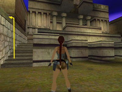 Climb onto the wall to the left of the temple. You'll need to position Lara on the steps below the right end of the wall, otherwise the top of the wall will be too high to reach. Or, climb onto the low block (pictured here just in front of Lara) and jump to the wall.