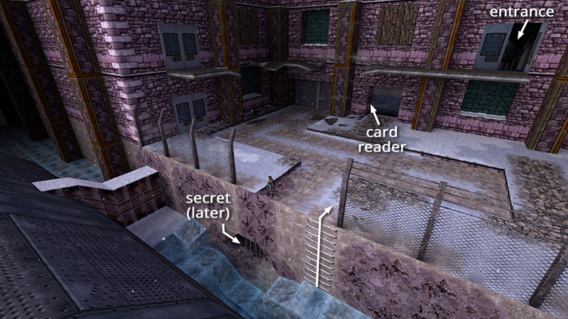 Return to the WAREHOUSE. Turn left and follow the wall, past the locker where you found the SILVER KEY earlier, to the other door with a card reader. (You hid here earlier but didn't have a card then.) Use the SWIPE CARD to open it and climb the stairs to one of the balconies overlooking the WAREHOUSE. (screenshots)