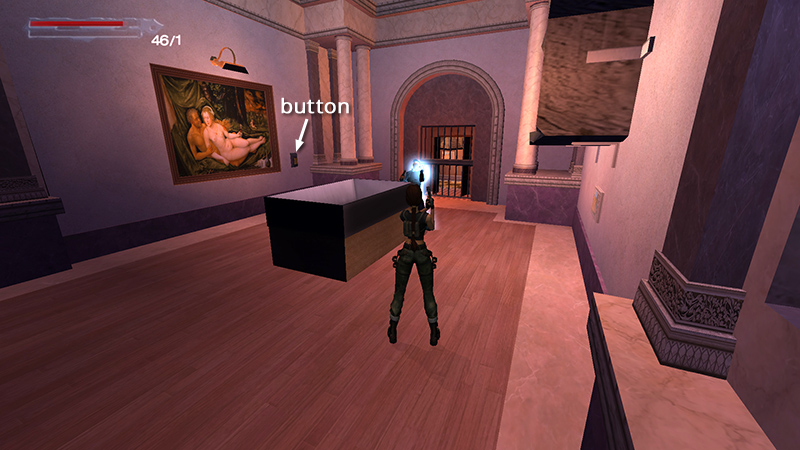 THIRD GALLERY: This is a long, narrow room with paintings on the walls and a single display case in the middle. The security guard (14) on patrol may or may not be facing your way as you enter. If he is, he'll call out and you'll immediately know you've failed. Load your save, wait about 30 seconds, save, and try again. If he's facing away from Lara, shock him quickly. Go to the far end of the room, use the card reader, and go through but don't rush forward. (screenshots)