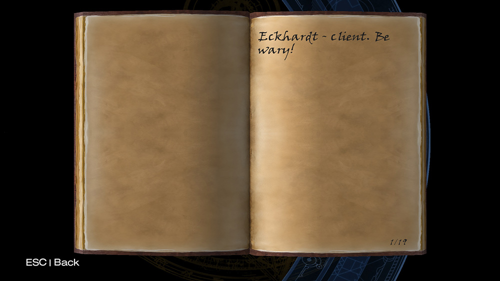 | 1 | Eckhardt - client. Be wary! | Margot Carvier's Apartment | screenshot | |
