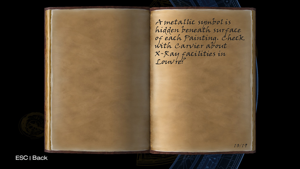 | 10 | A metallic symbol is hidden beneath surface of each painting. Check with Carvier about X-Ray facilities in Louvre? | Margot Carvier's Apartment | screenshot | |