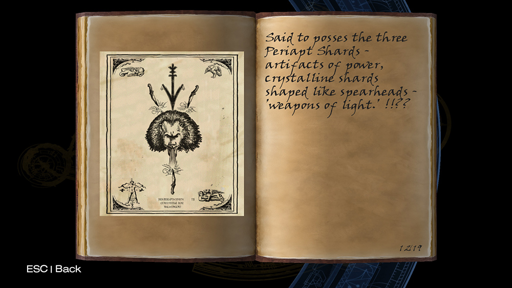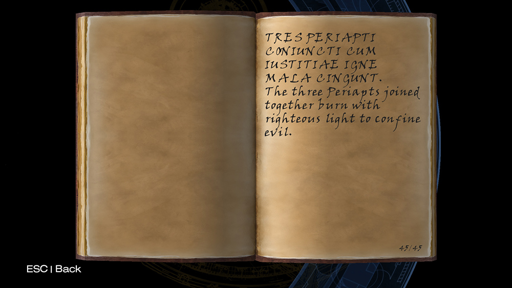 | 45 | TRES PERIAPTI CONIUNCTI CUM IUSTITIAE IGNE MALA CINGUNT. The three Periapts joined together burn with righteous light to confine evil. (Secret room at Vasiley's) | Monstrum Crime Scene | screenshot | |
