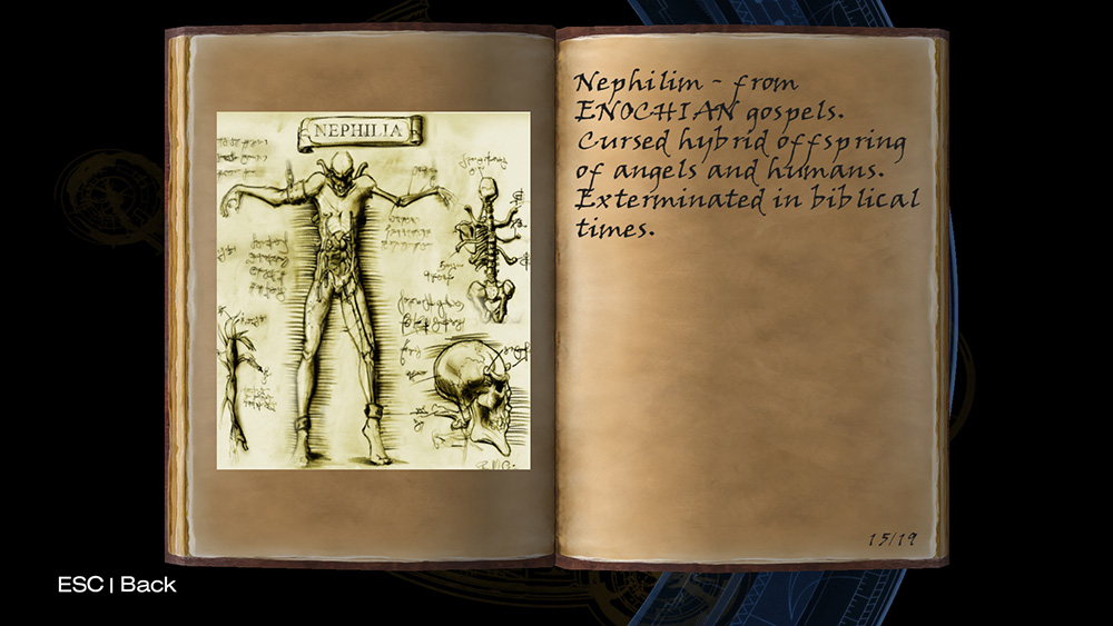 | 15 | Nephilim - from ENOCHIAN gospels. Cursed hybrid offspring of angels and humans. Exterminated in biblical times. [includes image] | Margot Carvier's Apartment | screenshot | |