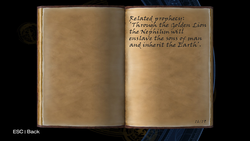 | 16 | Related prophecy: 'Through the Golden Lion the Nephilim will enslave the sons of man and inherit the Earth'. | Margot Carvier's Apartment | screenshot | |