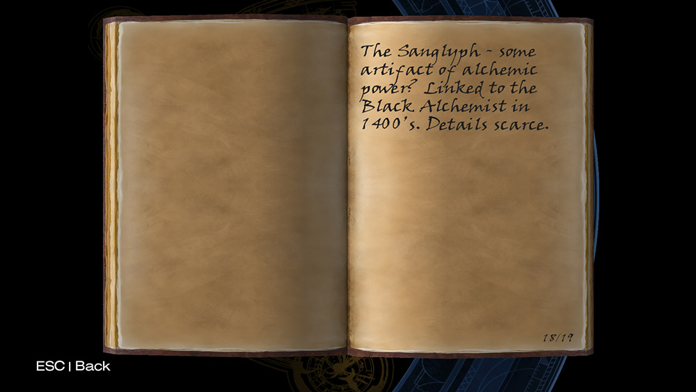 | 18 | The Sanglyph - some artifact of alchemic power? Linked to the Black Alchemist in 1400's. Details scarce. | Margot Carvier's Apartment | screenshot | |
