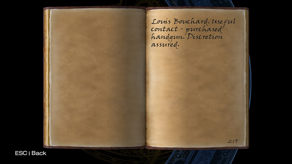 | 2 | Louis Bouchard. useful contact - purchased handgun. Discretion assured. | Margot Carvier's Apartment | screenshot | |