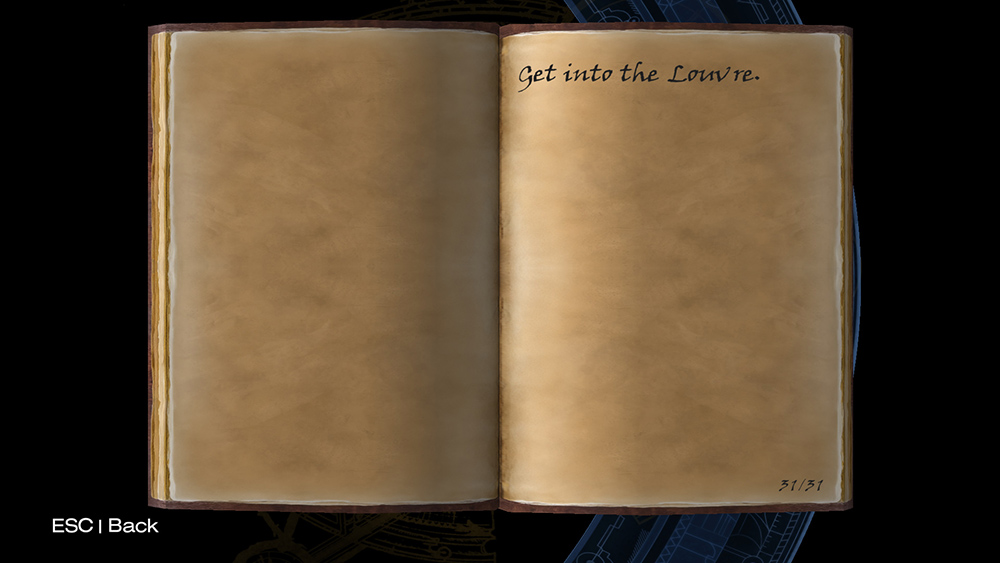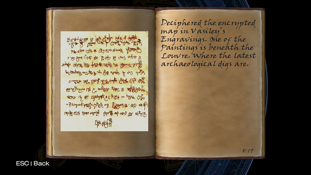| 8 | Deciphered the encrypted map in Vasiley's Engravings. One of the Paintings is beneath the Louvre. Where the latest archaeological digs are. [includes image] | Margot Carvier's Apartment | screenshot | |