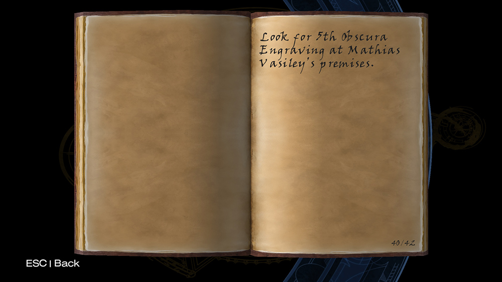 | 40 | Look for 5th Obscura Engraving at Mathias Vasiley's premises. (Luddick) | Monstrum Crime Scene | screenshot | |