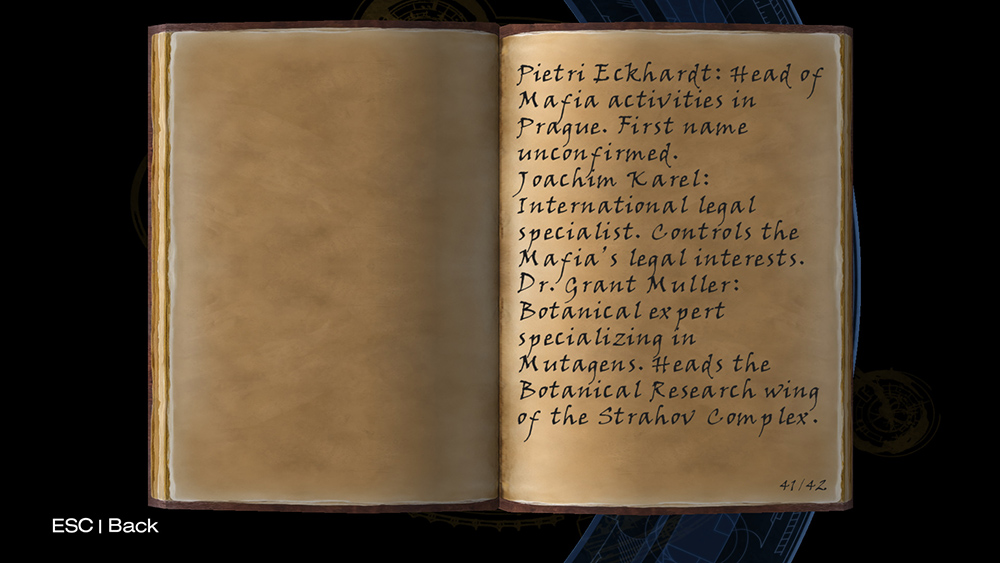 | 41 | Pietri Eckhardt: Head of Mafia activities in Prague. First name unconfirmed. Joachim Karel: International legal specialist. Controls the Mafia's legal interests. Dr Grant Muller: Botanical expert specializing in mutagens. Heads the Botanical Research wing of the Strahov Complex. (Luddick) | Monstrum Crime Scene | screenshot | |