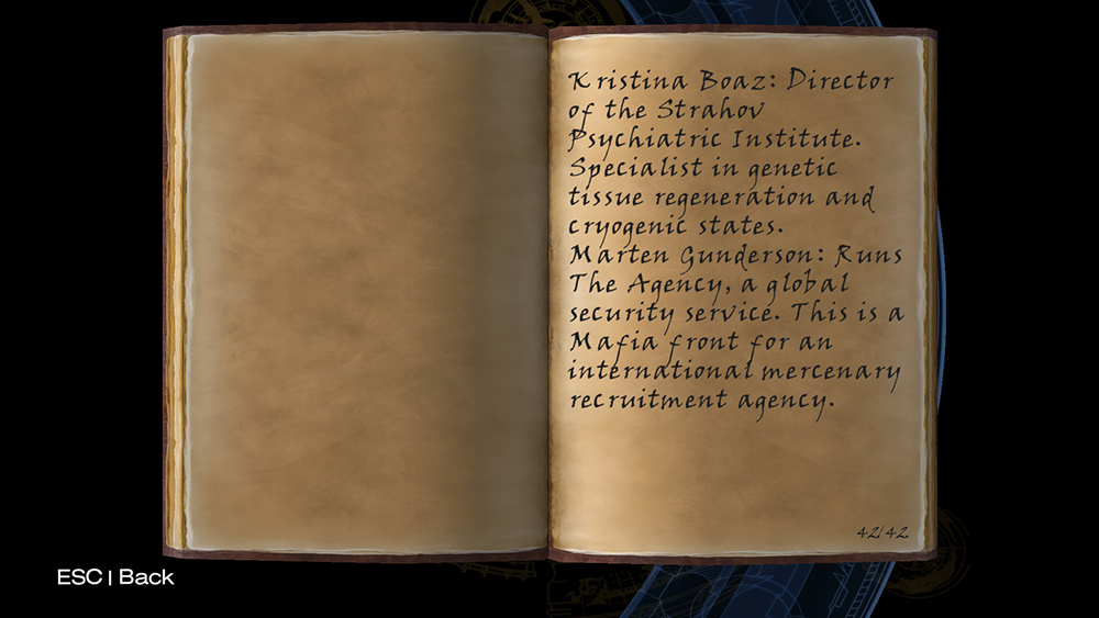 | 42 | Kristina Boaz - Director of the Strahov Psychiatric Institute. Specialist in genetic tissue regeneration and cryogenic states. Marten Gunderson: Runs The Agency, a global security service. This is a Mafia front for an international mercenary recruitment agency. (Luddick) | Monstrum Crime Scene | screenshot | |