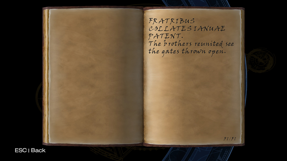 | 51 | FRATRIBUS COLLATES IANUAE PATENT. The brothers reunited see the gates thrown open. (Plaque in flooded room) | Vault of Trophies | screenshot | |