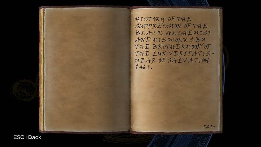 | 52 | HISTORY OF THE SUPPRESSION OF THE BLACK ALCHEMIST AND HIS WORKS BY THE BROTHERHOOD OF THE LUX VERITATIS - YEAR OF SALVATION 1461. (Book in Library) | Vault of Trophies | screenshot | |