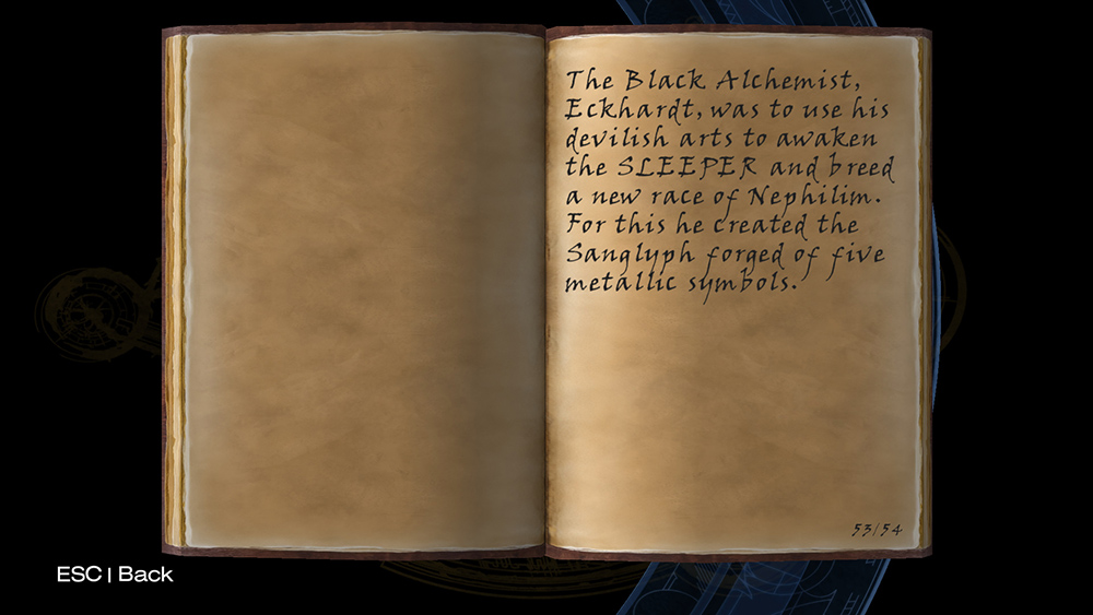 | 53 | The Black Alchemist, Eckhardt, was to use his devilish arts to awaken the SLEEPER and breed a new race of Nephilim. For this he created the Sanglyph forged of five metallic symbols. (Book in Library) | Vault of Trophies | screenshot | |