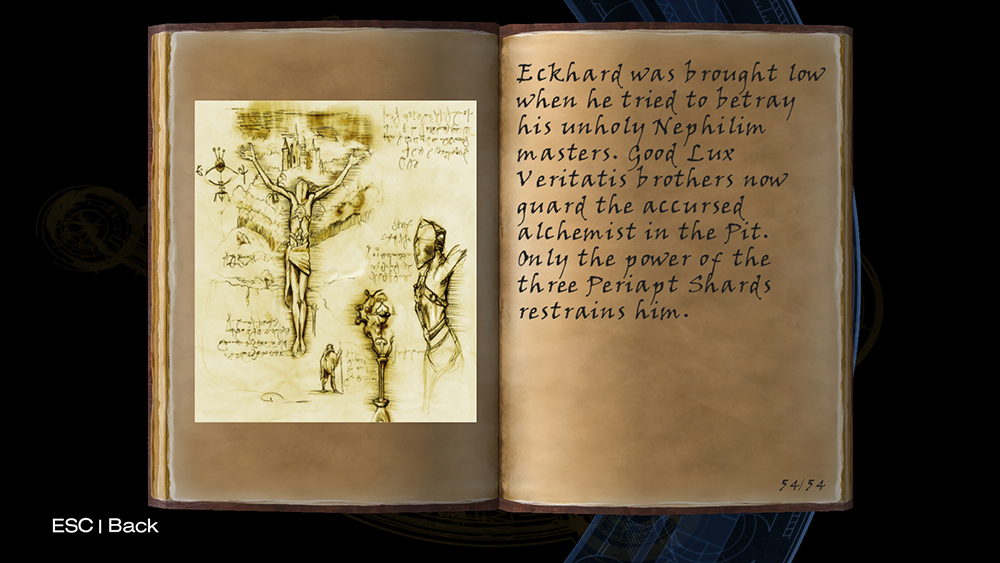 | 54 | Eckhardt was brought low when he tried to betray his unholy Nephilim masters. Good Lux Veritatis brothers now guard the accursed alchemist in the Pit. Only the power of the three Periapt Shards restrains him. (Book in Library) | Vault of Trophies | screenshot | |
