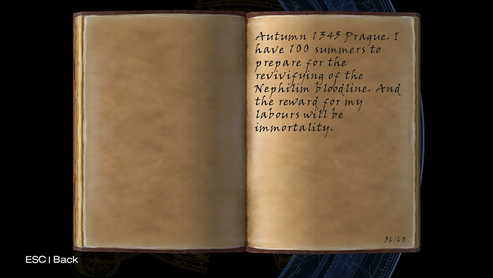 | 56 | Autumn 1345 Prague. I have 100 summers to prepare for the revivifying of the Nephilim bloodline. And the reward for my labours will be immortality. (Open book in Laboratory) | Eckhardt's Lab | screenshot | |