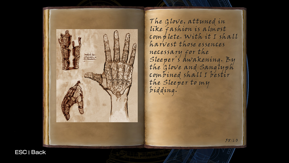| 58 | The Glove, attuned in like fashion is almost complete. With it I shall harvest those essences necessary for The Sleeper's awakening. By the Glove and Sanglyph combined shall I bestir The Sleeper to my bidding. (Open book in Laboratory) | Eckhardt's Lab | screenshot | |