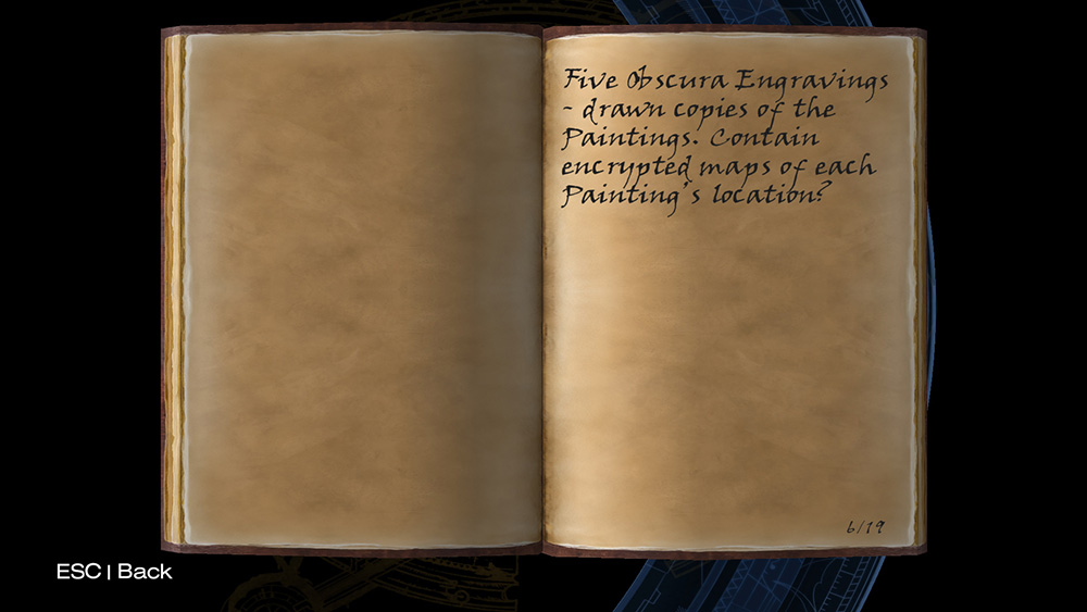| 6 | Five Obscura Engravings - drawn copies of the Paintings. Contain encrypted maps of each Painting's location? | Margot Carvier's Apartment | screenshot | |