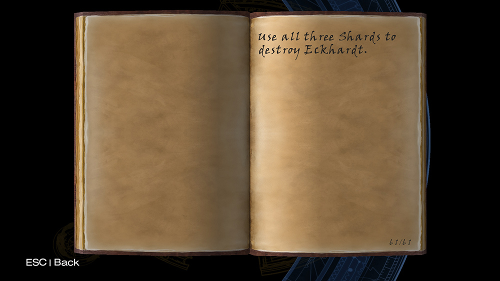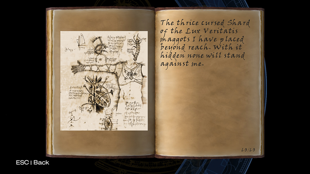 | 60 | The thrice cursed Shard of the Lux Veritatis maggots I have placed beyond reach. With it hidden none will stand against me. (Open book in Laboratory) | Eckhardt's Lab | screenshot | |