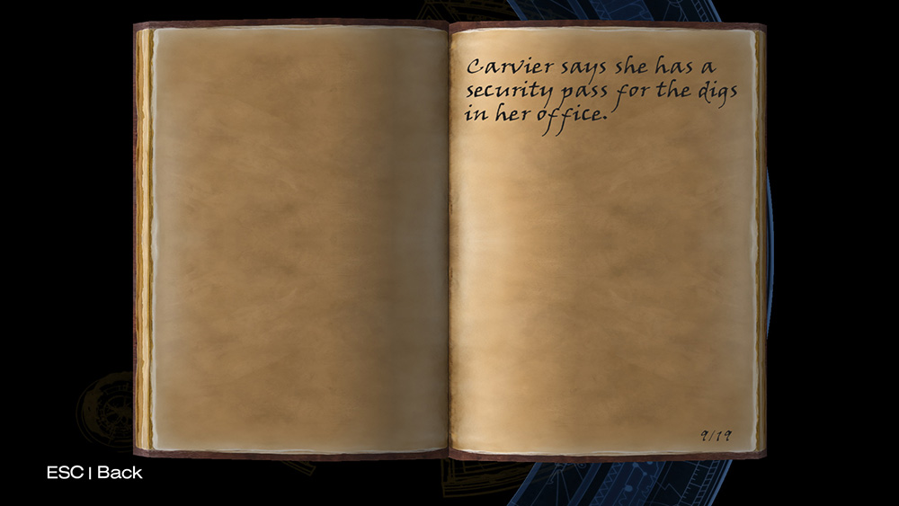 | 9 | Carvier says she has a security pass for the digs in her office. | Margot Carvier's Apartment | screenshot | |